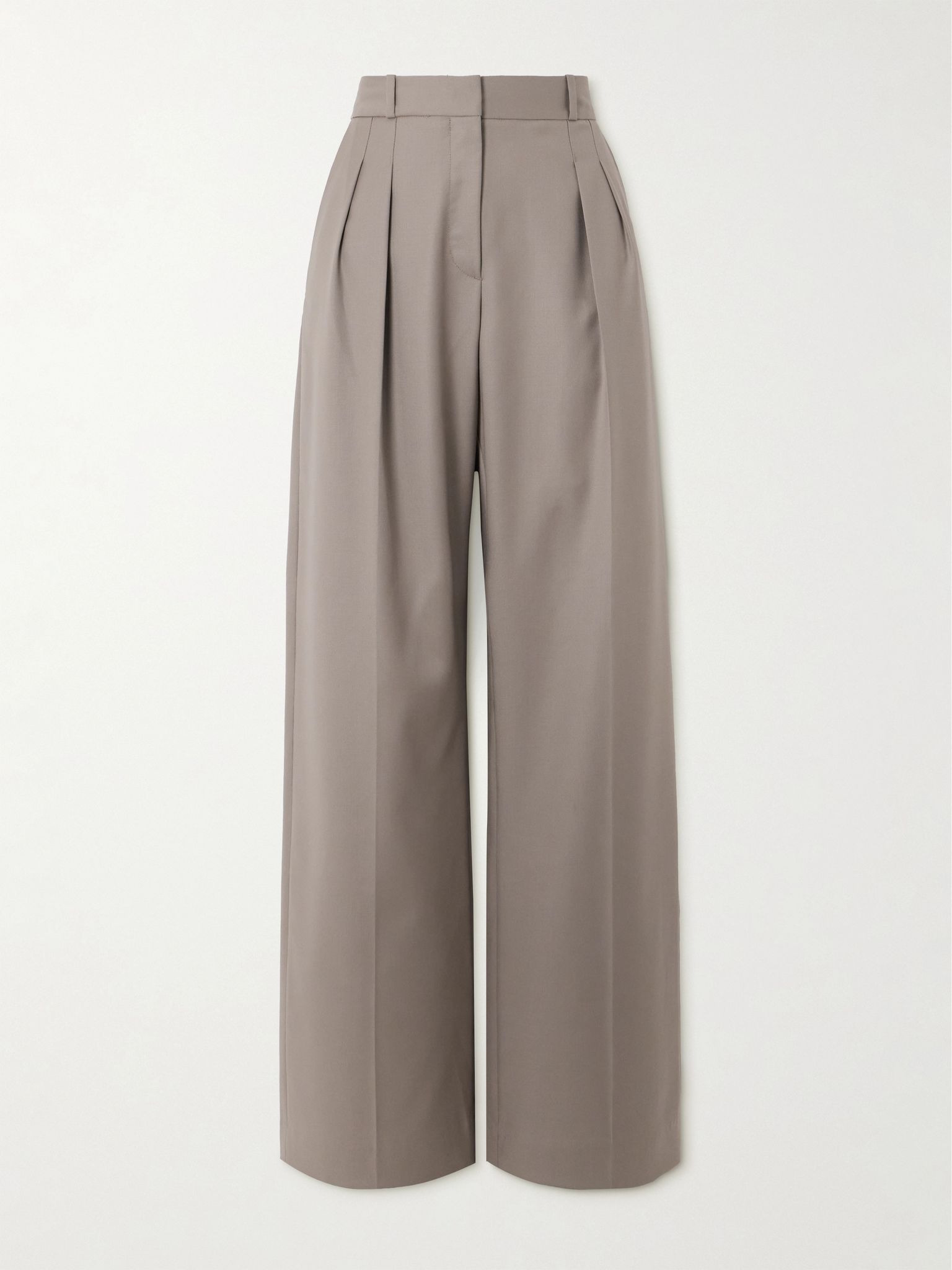 Loulou de Saison's 'Sbiru' pants are a classic, sophisticated and endlessly versatile pair you'll keep in your wardrobe for years to come. Tailored from wool-twill, they have a high rise and sharp pleats that enhance the wide shape of the legs. Style yours with a collared shirt or casual tee. Size & Fit - Fits true to size, take your normal size - High-rise, designed for a straight-leg fit - Mid-weight, non-stretchy fabric - Model is 177cm/ 5'10" and is wearing a FR 36 Model measurements: - Bust: 80cm/ 31.5" - Waist: 60cm/ 23.5" - Hip: 89cm/ 35" Details & Care - Beige wool-twill - Concealed hook, button and zip fastening at front - 100% wool - Hand wash