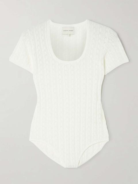 EDITORS'NOTES LOULOU STUDIO's 'Silas' bodysuit has been pointelle-knitted in a delicate, lacy pattern. It's made with plenty of stretch for a form-fitting shape and has a rounded neckline to frame a pendant or two. Wear yours with jeans and skirts alike. SIZE & FIT - Fits true to size, take your normal size - Designed for a close fit - Medium brief coverage - Lightweight, open knit - S/M/L sizing DETAILS & CARE - Black pointelle-knit - Snap fastenings at base - 53% viscose, 29% polyamide, 18% elastane - Hand wash