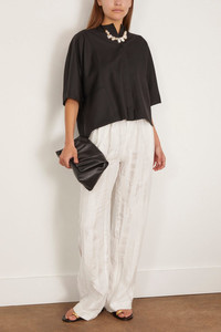 The Loulou Studio Soler Elastic Waistband Pant are crafted in a beautiful textured cotton. You'll love the relaxed fit of these wide leg pants with a drawstring waistband. Wear yours with the matching top and sandals. FIT DESCRIPTION MODEL MEASUREMENTS - Fits true to size, take your normal size - Wide leg - Relaxed fit - Drawstring waistband - Textured cotton - 60% silk 40% cotton - Bust: 32” - Waist: 25” - Hips: 34” - Height: 5’7”