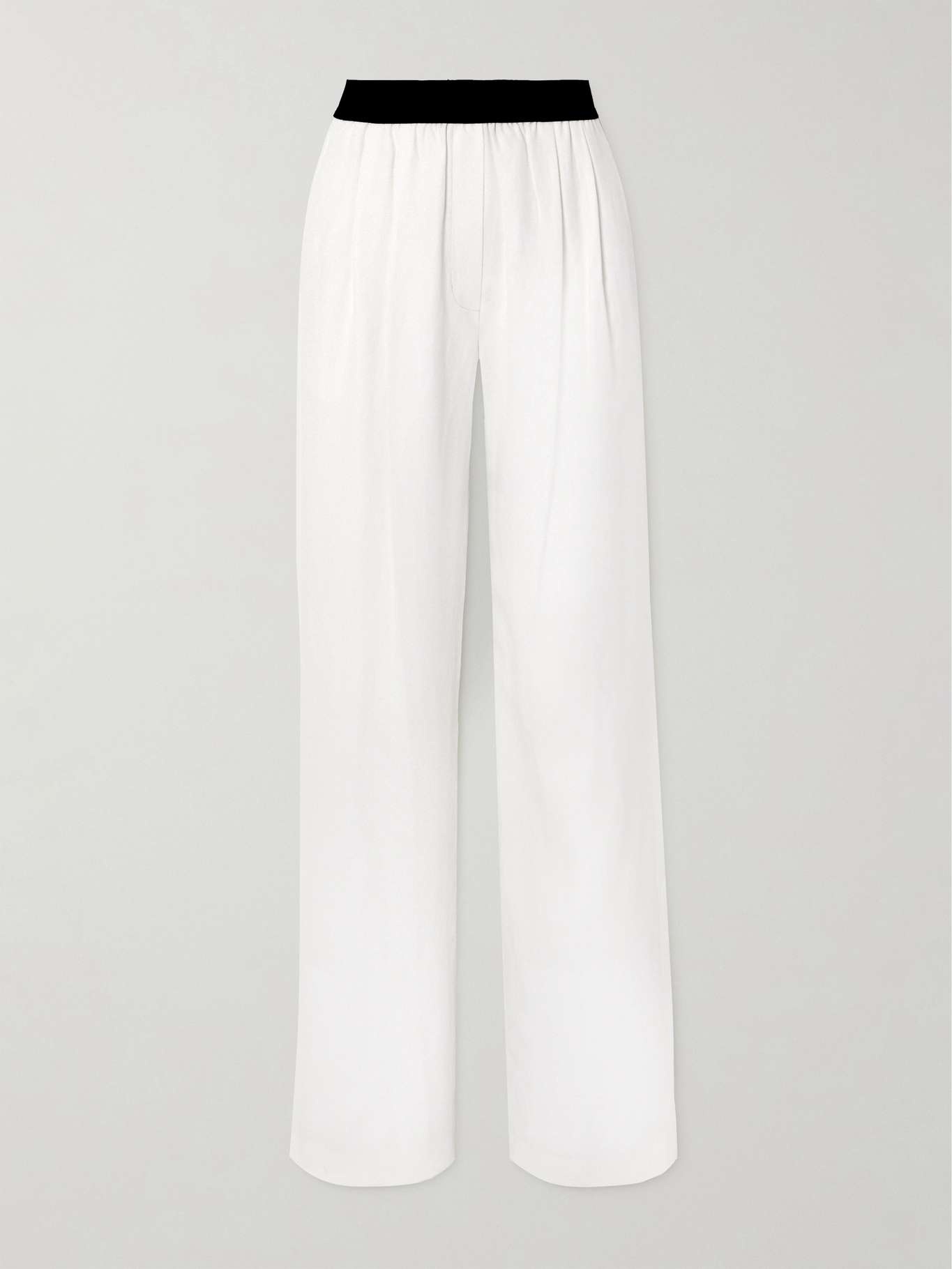 EDITORS'NOTES LOULOU STUDIO's pants are so versatile - style them with a blazer, tank and heels for work, then add gold jewelry and a red lip for cocktails after. They're tailored from certified twill blended with a touch of linen and have an elasticated high waist. Lower-Impact Materials. This product is made using at least 50% lower-impact materials or ingredients. Find out more about our NET SUSTAIN criteria here. SIZE & FIT - Fits true to size, take your normal size - High-rise, cut for a straight-leg fit - Elasticated at the waist for a comfortable fit - Mid-weight, non-stretchy fabric - Model is 177cm/ 5'10" and is wearing a size XSmall DETAILS & CARE - Ivory and black twill - Pull on - 85% viscose, 15% linen; lining: 100% viscose - Dry clean