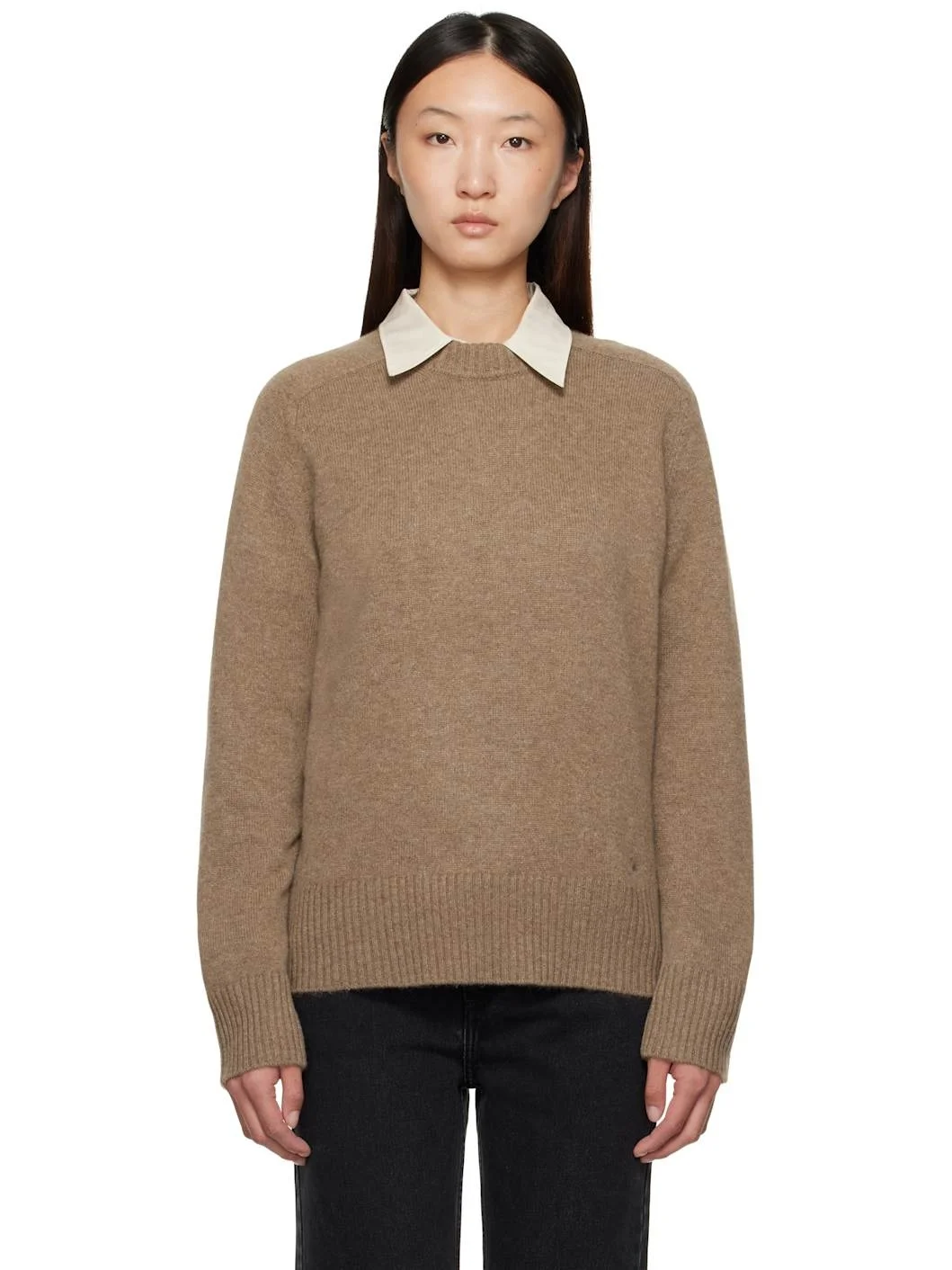 Knit cashmere sweater. · OEKO-TEX® STANDARD 100-certified · Rib-knit crewneck, hem, and cuffs · Saddle shoulders Supplier color: Taupe melange 100% cashmere. Made in Italy 252473F096017