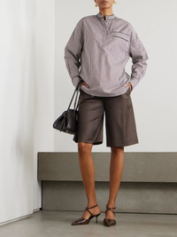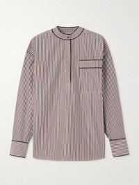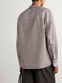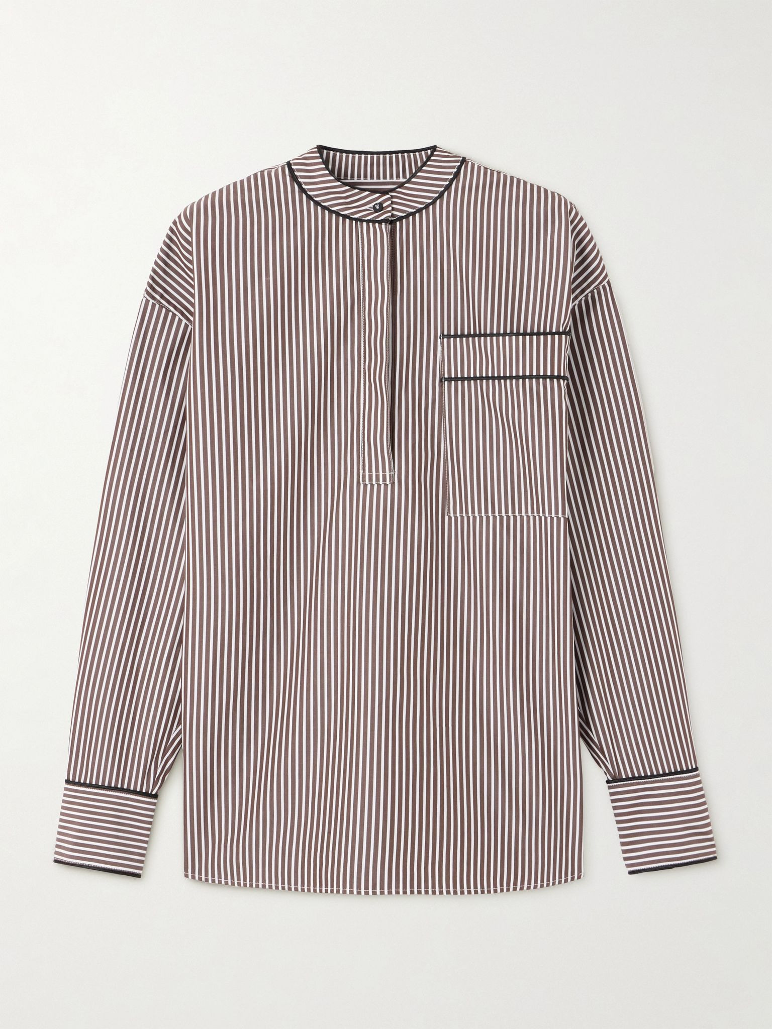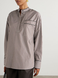 Loulou de Saison's 'Verna' style offers a contemporary take on classic shirting. It's cut from crisp cotton-poplin patterned with stripes and has a sleek mandarin collar. The elongated hem looks so chic left untucked. Size & Fit - Fits true to size, take your normal size - Designed for a loose fit - Mid-weight, non-stretchy fabric - Model is 177cm/ 5'10" and is wearing a FR 36 Model measurements: - Bust: 86cm/ 34" - Waist: 65cm/ 25.5" - Hip: 90cm/ 35.5" Details & Care - Brown and white cotton-poplin - Partially concealed button fastenings along front - 100% cotton - Machine wash