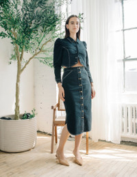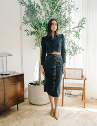 The Apolline Skirt is a high-waisted denim midi with contrast stitching and a full button-down front. Its structured silhouette and versatile dark wash make it an effortless piece for day-to-night styling.