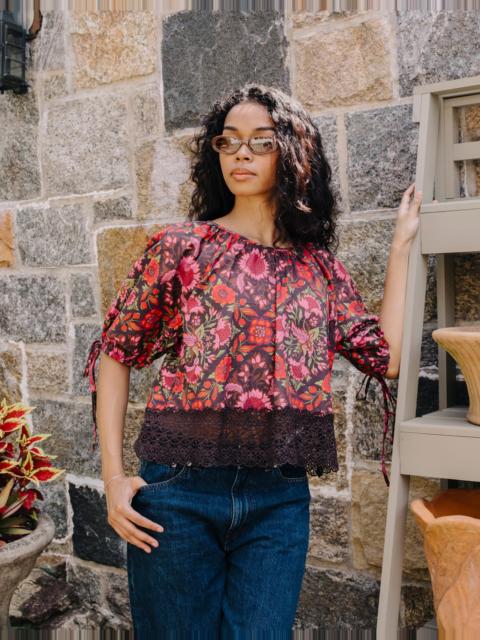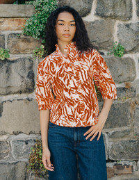 The Carolina Top brings tailored edge to bold print with its structured silhouette, puff sleeves, and subtle ruffle trim.