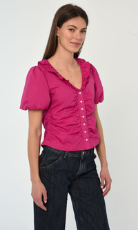 The Kaia Top is a new Love the Label silhouette. Offered this season in our classic Cotton Poplin in Carmine Pink,it features a ruffle around the neckline and shell buttons down the center front.This top is entirely gathered at the side seams and shoulders to create a full puff sleeve.Wear it buttoned up or open as a versatile option this season.