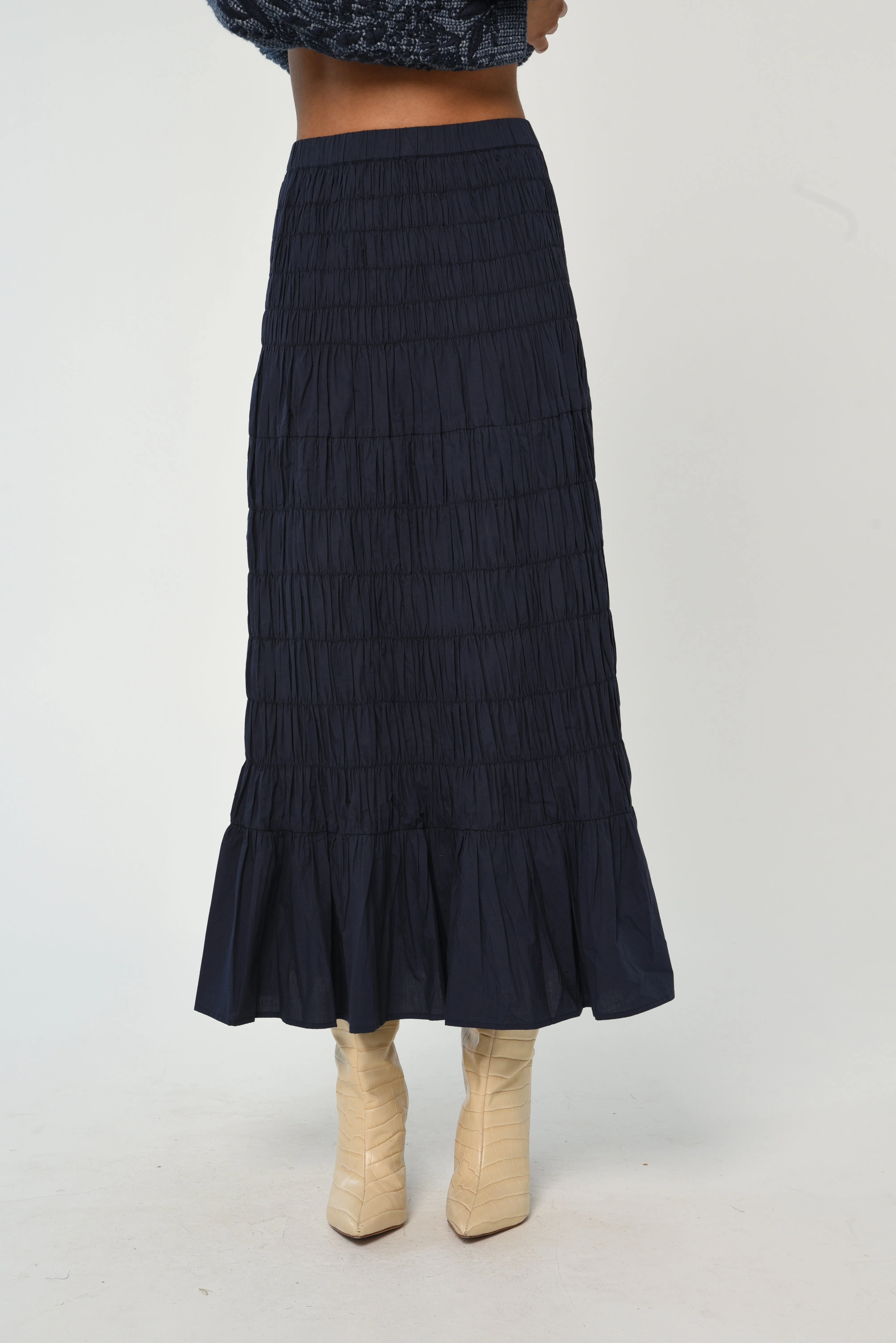 The Kelly Skirt in our classic Cotton poplin,Mood Indigo is a wardrobe staple! Designed with smocking throughout the body and a comfortable encased elastic waistband. This skirt is unlined.