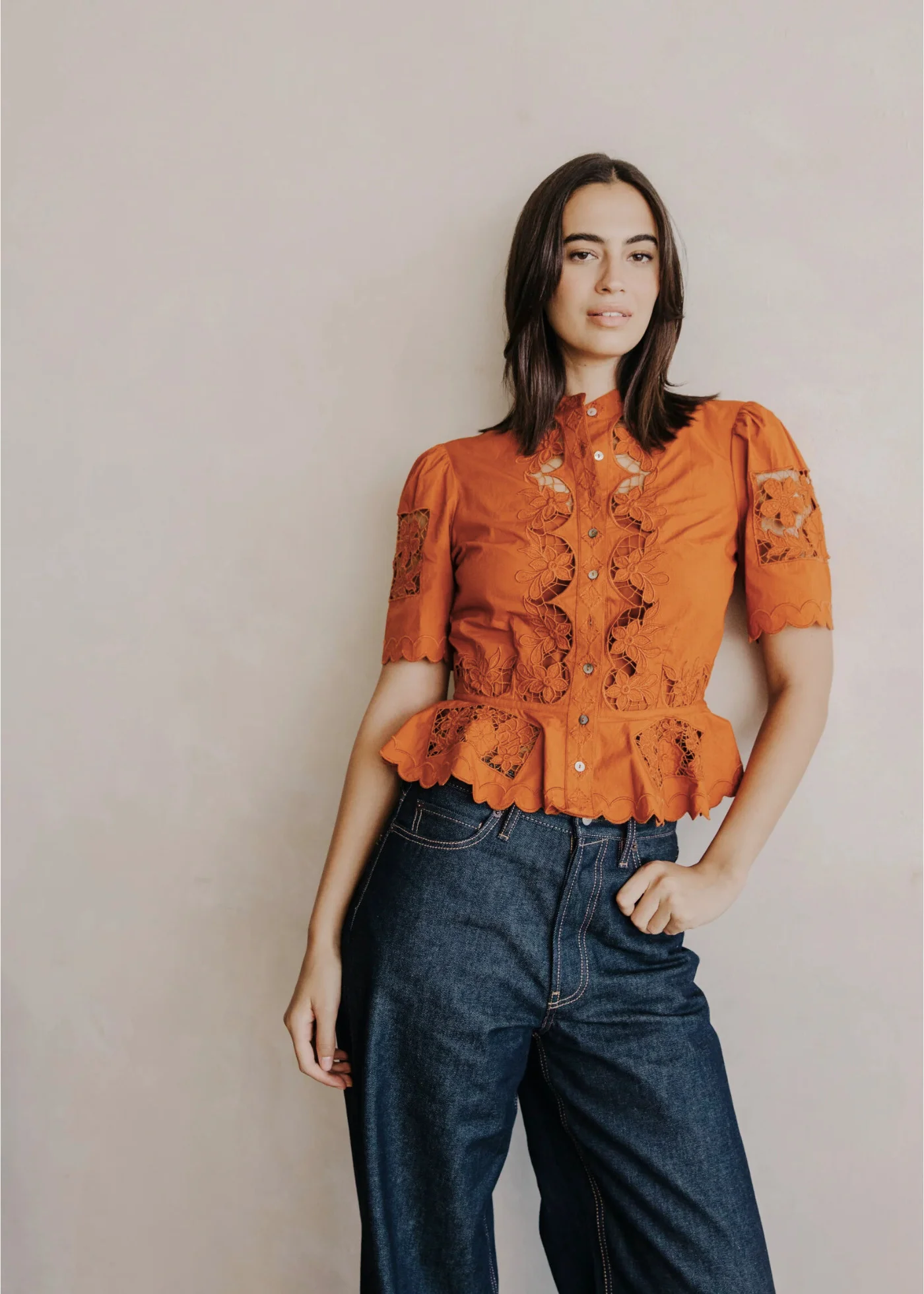The Elizabeth Top in cinnamon features intricate floral cutwork lace with scalloped edges and a peplum hem. Designed with short puff sleeves, a high neckline, and button-down front.