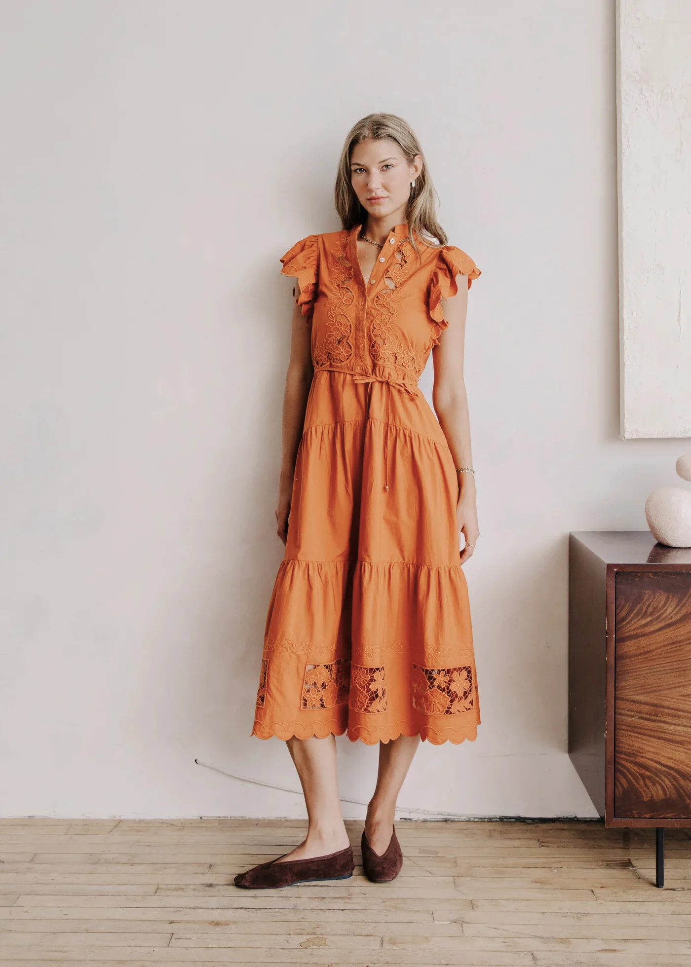 The Romy Dress is a breezy midi with flutter sleeves, lace insets, and a flattering self-tie waist— effortlessly feminine and timeless.