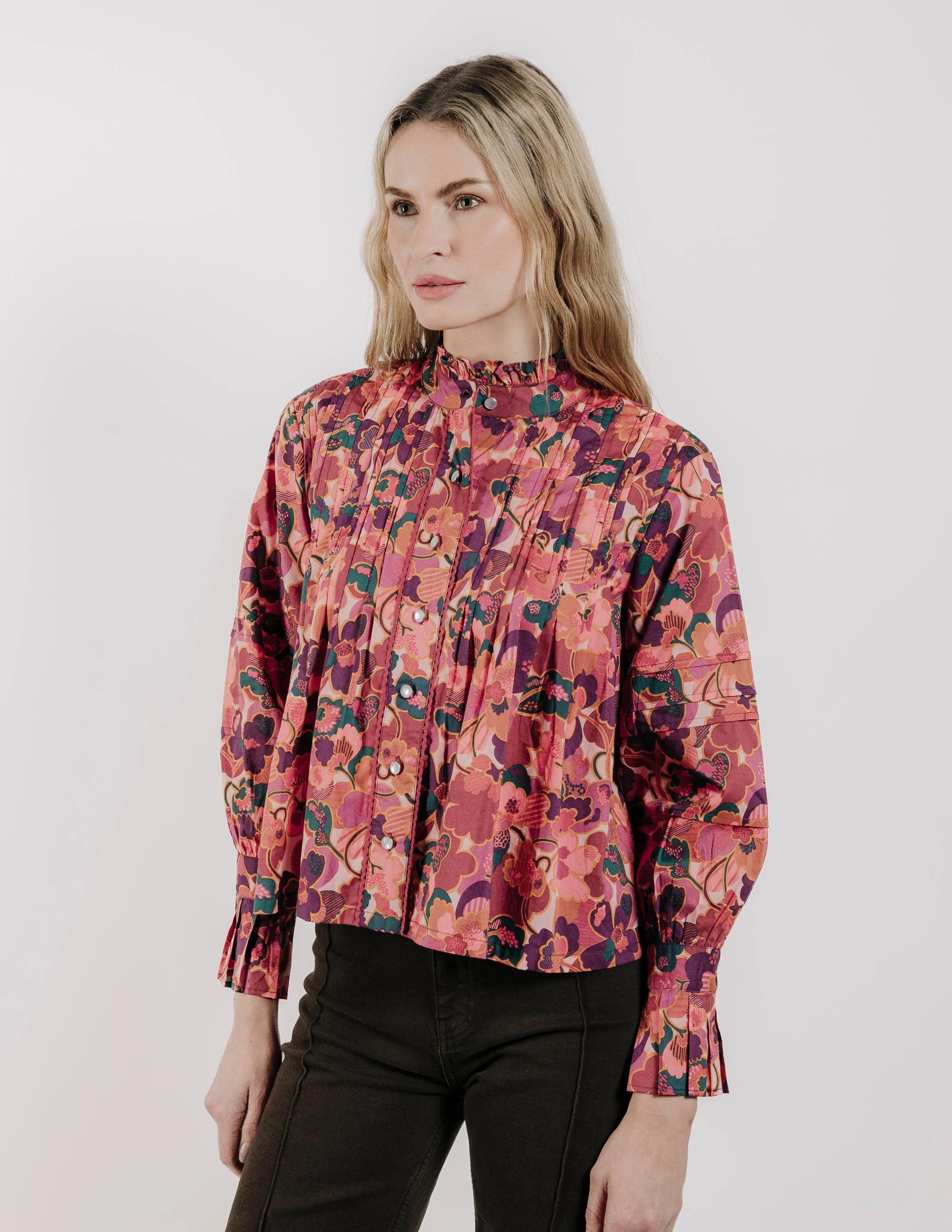 Love the Label’s newest collection of Made with Liberty Fabrics is now available in your favorite bestseller silhouettes. Designed exclusively in Liberty fabrics, made with their exclusive Tana Lawn™ cotton fabric quality. The Wiley Top in Prospect Floral Print is a vibrant statement piece with intricate highlights at the sleeves, neckline, and front button placket. Designed with feminine pintucks and a bold floral palette, it’s a versatile top that adds effortless charm to both casual denim and tailored looks.
