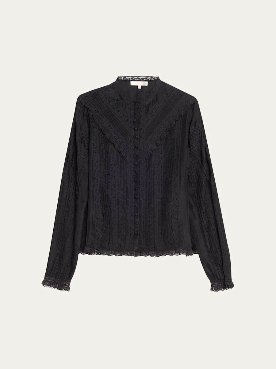 The feminine and sophisticated "Aralina" blouse by LoveShackFancy is crafted from luxe, silk habotai fabric with delicate Victorianinspired lace detailing High collared neckline; selfcovered snap front Long blouson sleeves; snap cuffs Relaxed fit Hip length Silk Dry clean Imported