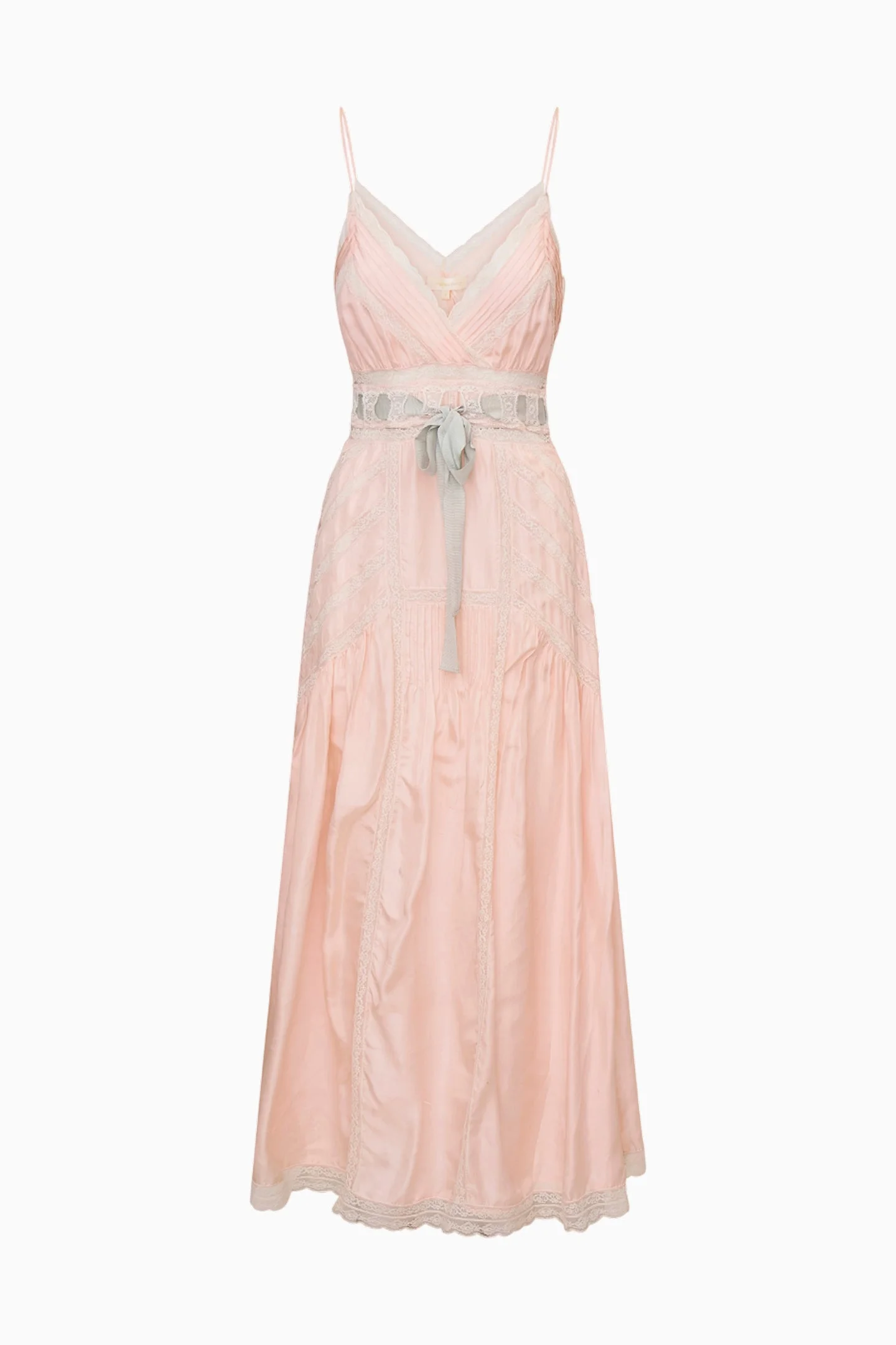 Introducing the Arlissa Dress. Designed from a luxe silk habotai fabric, the lightweight, Bohemian-inspired maxi features a straight silhouette that’s fitted throughout the hip which then releases into a modest A-line skirt. A grosgrain ribbon is threaded around the waist, the front features an overlap detail, and the piece is lined with a polly georgette fabric. - 100% Silk - Comes lined - Spaghetti straps - Includes a zipper - Maxi length DETAILS - Dry Clean Only - Shell: 100% Silk - Lining: 100% Polyester SIZE & FIT Measurements based on Size 4: - Front Length: 54" - Bust: 33 1/2" - Waist: 29" - Low Hip: 41" - Sweep: 79" - Strap Length: 10 3/4"
