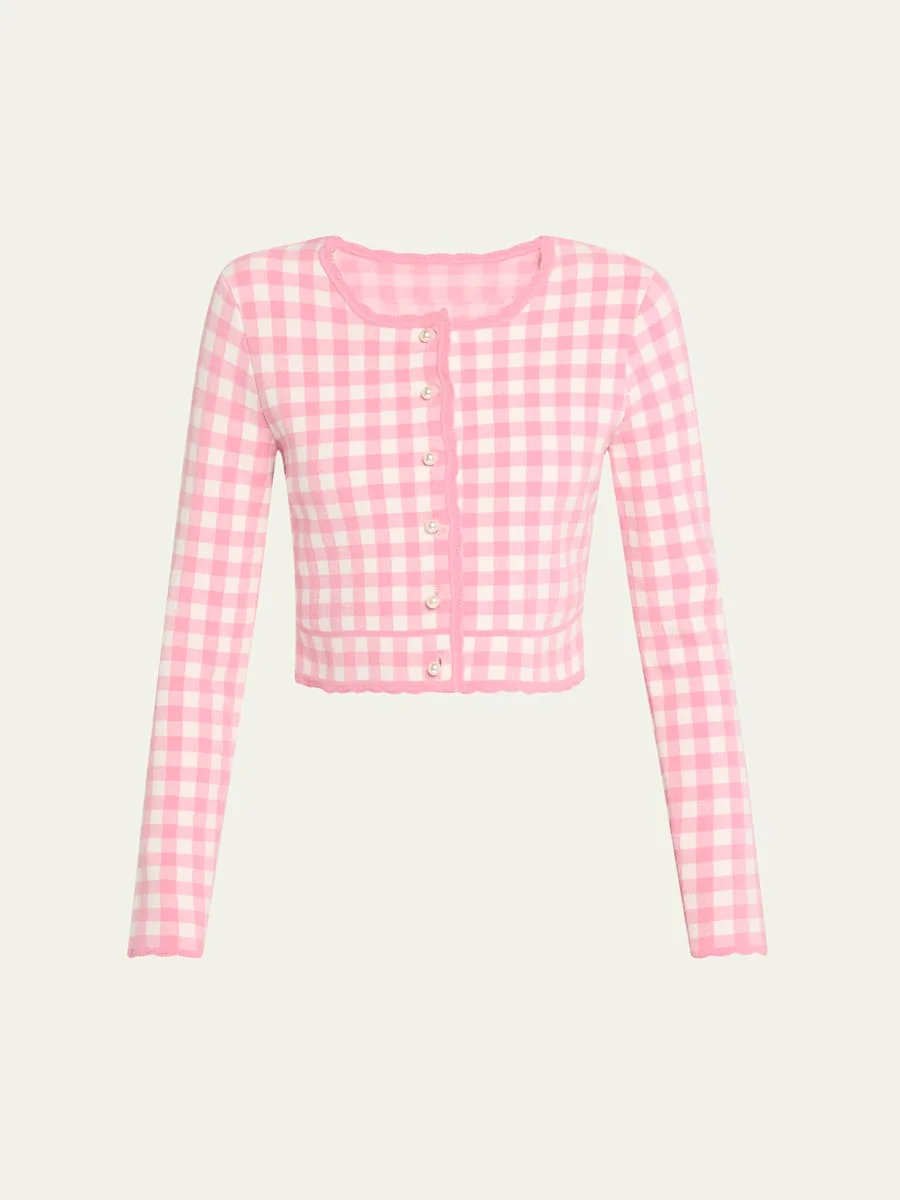 LoveShackFancy "Brigette" gingham cardigan complete with scalloped edging and pearly buttons Crew neckline Long sleeves Slim fit Cropped hem Button front closure Viscose/spandex/polyester Unlined Hand wash, do not bleach, lay flat to dry, cool iron Imported