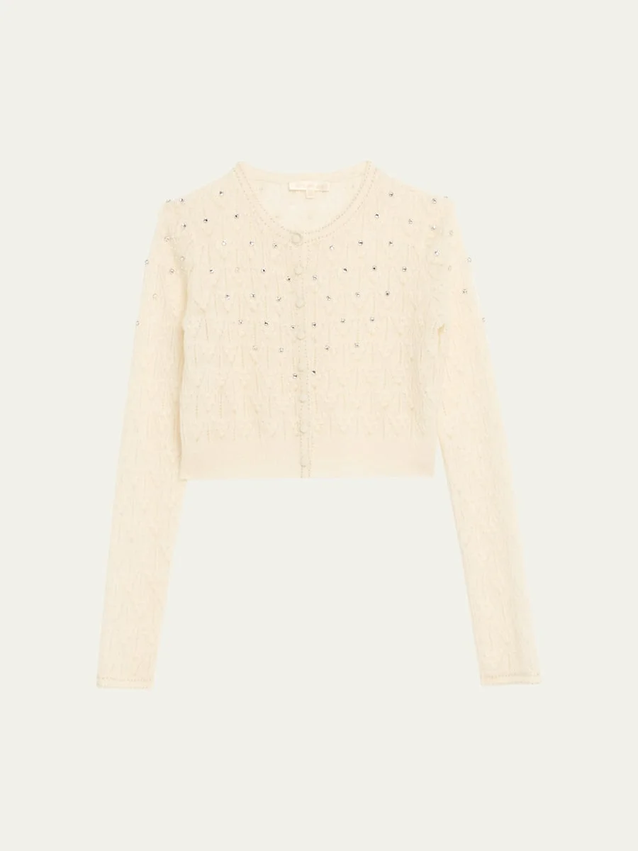 Featuring a delicate pointelle stitch with a subtle diamond pattern, the "Calico" cardigan by LoveShackFancy is dotted with imitation pearls and crystal embellishments Crew neckline Long sleeves Slim fit Hip length Selfcovered button front Alpaca/wool/nylon Hand wash or dry clean Imported