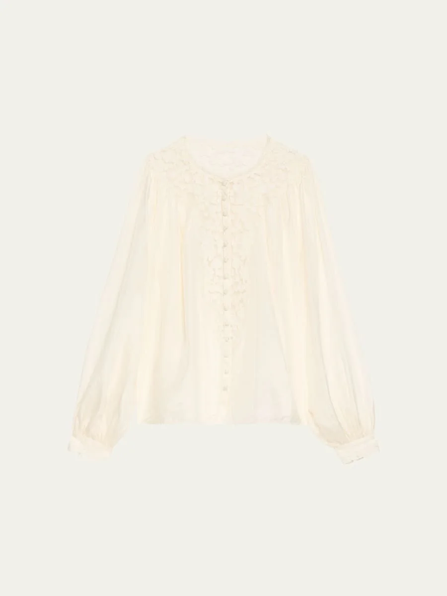Designed in lightweight silk habotai, LoveShackFancy's "Carine" top is embroidered with mesh that mimics classic lace for a romantic touch Crew neckline; center placket with faux buttons Long blouson sleeves; button cuffs Relaxed fit Hip length Viscose/polyester/spandex Hand wash or dry clean Imported