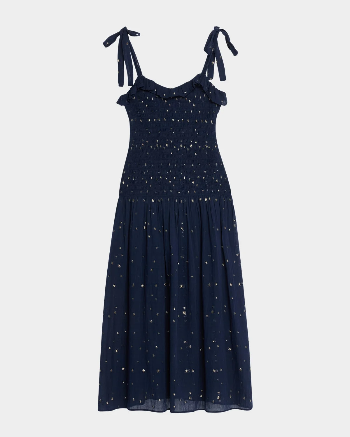 The "Hillaria" dress from LoveShackFancy is designed in cotton voile with a metallic star design and subtle ruffling along the neckline Scoop neckline Selftie shoulder straps Smocked bodice Hem falls below the knee Fitandflare silhouette Slipover style Cotton Lining: Cotton Dry clean or hand wash Imported