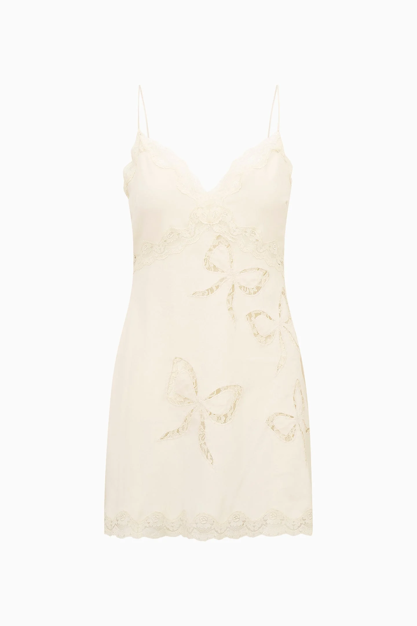 The Cori Dress is a playful new mini in our crepe fabric with a drapey, matte feel. Cut on the bias for a flattering, body-skimming fit, this whimsical style is adorned with an allover medley of bow lace appliques — a charming nod to vintage romance. Effortless to slip on and instantly eye-catching, she’s the perfect balance of sweet and flirty. - 100% Polyester - Bias cut DETAILS - Shell: 100% Polyester - Combo: 100% Nylon - Dry Clean or Hand Wash In Cold Water - Do Not Bleach - Lay Flat To Dry - Cool Iron If Needed SIZE & FIT Measurements based on Size S: - Front Length: 31" - Bust: 32 1/2" - Waist: 30" - Sweep: 46"