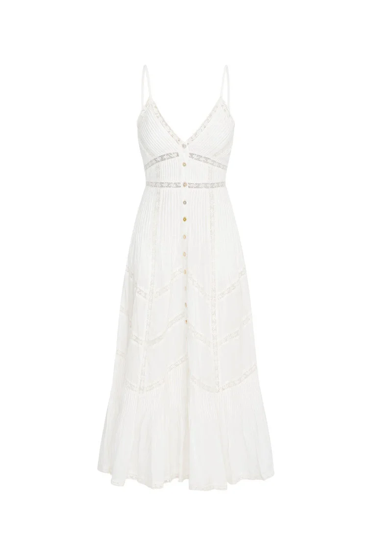 Timeless and effortlessly chic, the Esilda Dress is an airy cotton midi beginning with spaghetti straps above a v-neckline that sits above a fitted waist yoke that descends to a center front placket with buttons. This piece has a smocked back for easy and comfortable wear. DETAILS - 100% Cotton - Hand Wash In Cold Water - Do Not Bleach - Lay Flat To Dry - Low Iron SIZE & FIT Measurements based on Size 4: - Bust: 32" - Waist: 28" - Hip: 53 1/2" - Garment Length: 52 1/2" - Model 1 Height (White Dress): 5'11" - Model 2 Height (White Dress): 5'8" - Model Height (Pink Dress): 5'11"