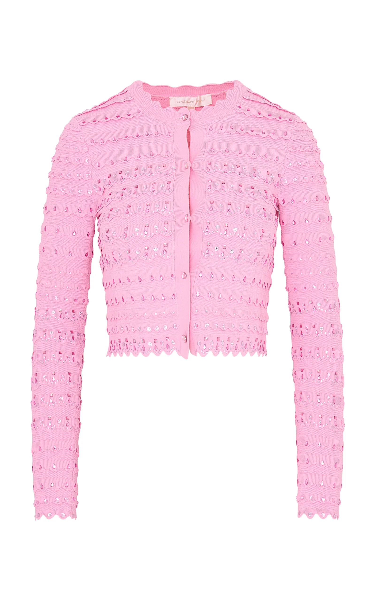 EMBELLISHED CARDIGAN PRODUCT DETAILS - Resort '26 - Regular fit, crystal embellished throughout, scallop detailing hemline - Unlined - Composition: 65% VISCOSE, 35% NYLON - Front Button Closure - *Dry clean only - Made in China