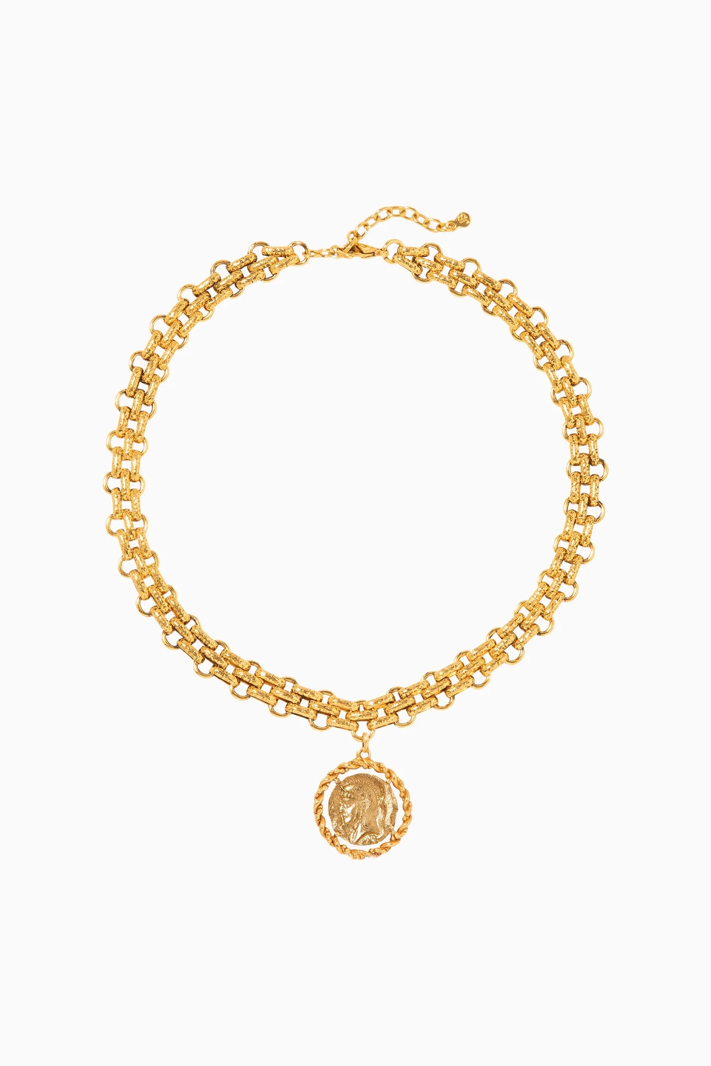 The Augusta necklace from Jennifer Behr is crafted of thick 18K-gold-plated brass centered by a charm with a sculpted relief motif, framed in a twisted circle. - 18K-gold-plated brass - Lobster clasp - Made in USA DETAILS 18K-gold-plated brass SIZE & FIT Adjustable: about 16”-18”L