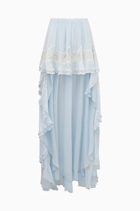 The Jolina Skirt is a high-to-low maxi designed from dreamy, lightweight chiffon—perfect for warm-weather getaways. Designed with an elastic waistband for easy pull-on styling, the skirt hits mini at the front and maxi at the back, with a lined body for comfort. Delicate scalloped lace strips throughout add romantic, bohemian detailing. Pair with the Lova Top for a full set. Details: - 100% Silk - High-to-low maxi silhouette with elastic waistband - Lined for comfort - Scalloped lace striping throughout - Lightweight chiffon, perfect for warm-weather occasions DETAILS - Shell: 100% Silk - Lining: 100% Polyester - Dry Clean Only SIZE & FIT Measurements based on Size S: - Length: 32" - Chest: 35 1/2" - Empire waist seam: 30" - Waist: 30 1/2" - High hip: 36" - Sweep: 56" - Sleeve length: 7 1/4"