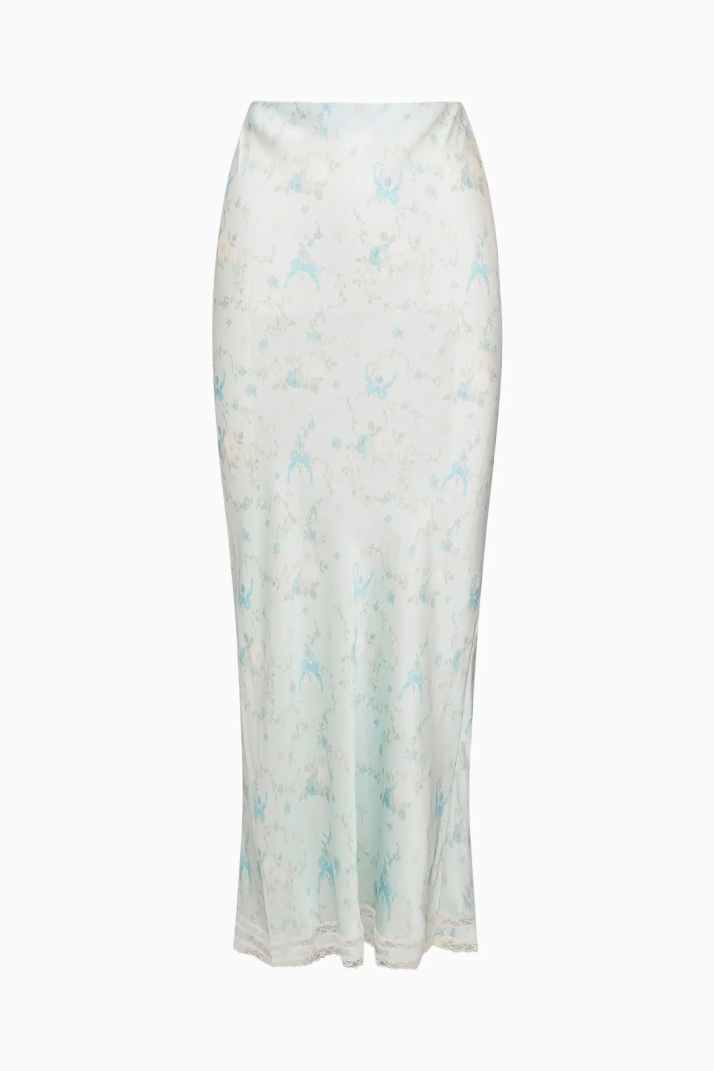 The Kalo Skirt is a flirty maxi designed from our custom satin jacquard. Cut on the bias for an effortless drape, it features an elastic waistband for easy pull-on styling and delicate lace trim at the hem. Slightly longer than our signature Castle Skirt, Kalo pairs perfectly with the Lirena Top. Details: - 60% Viscose, 40% Silk - Bias-cut maxi skirt with elastic waistband - Easy pull-on styling - Lace-trimmed hem DETAILS - 60% Viscose - 40% Silk - Dry Clean Only SIZE & FIT Measurements based on Size S: - Length: 35" - Waist: 28 1/2" - Low Hip: 39" - Sweep: 45"