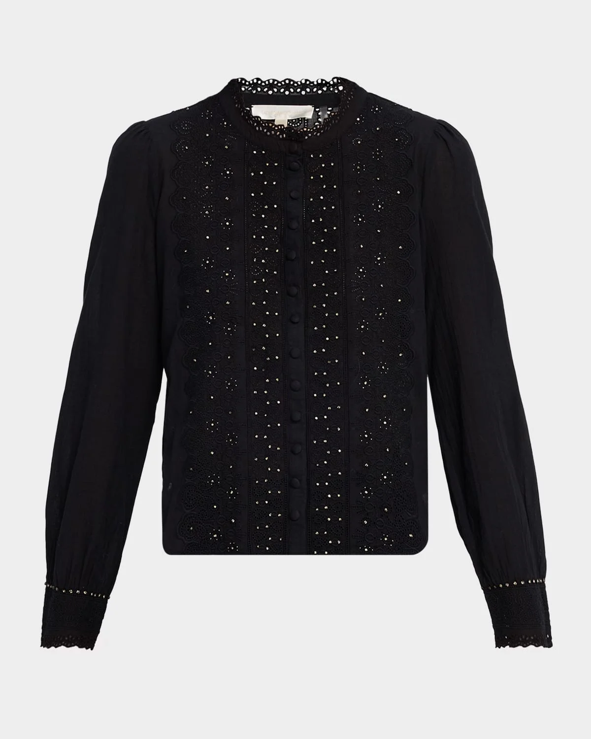 Crafted of cotton, LoveShackFancy's "Larine" top is designed with crystal embellishment on lace. Scalloped neckline Long sleeves with scalloped cuffs Relaxed fit Hip length Button front closure Cotton Dry clean Imported