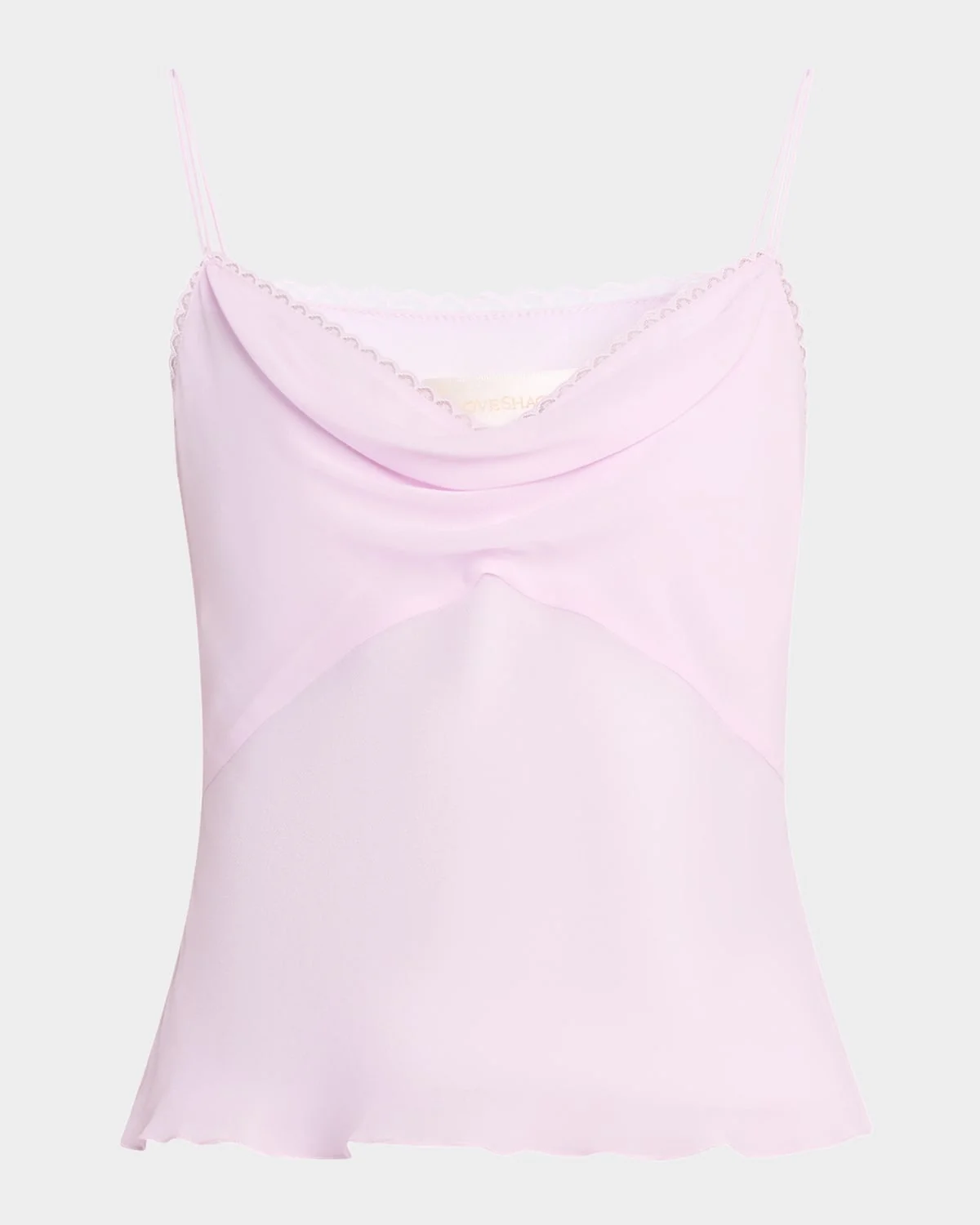 LoveShackFancy "Lavoir" tank top with feminine lace trim and a cowl front accent V neckline Sleeveless Relaxed fit Hip length Slipover style Rayon/cellulose acetate Imported