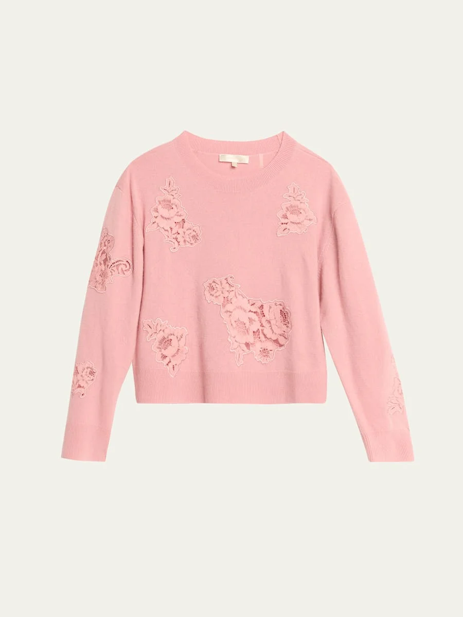 Designed with inset organic lace shapes throughout the body and sleeves, the "Lazuli" sweater by LoveShackFancy offers delicate cutaways that reveal subtle sheerness for a romantic, airy effect Crew neckline Dropped shoulders Long sleeves; approx. 31"L Relaxed fit Hip length Pullover style Cashmere/wool Dry clean only Imported