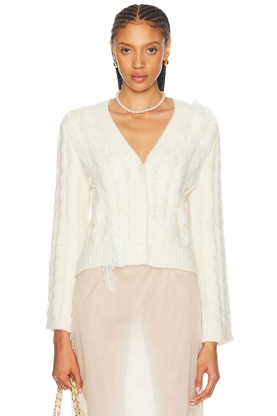 Details - 70% alpaca, 23% nylon, 7% wool - Made in Peru - Dry clean only - Front button closure - Cable-knit fabric with lace intertwined at front - Our Style No. LNCF-WK40 - Manufacturer Style No. K1713-2068