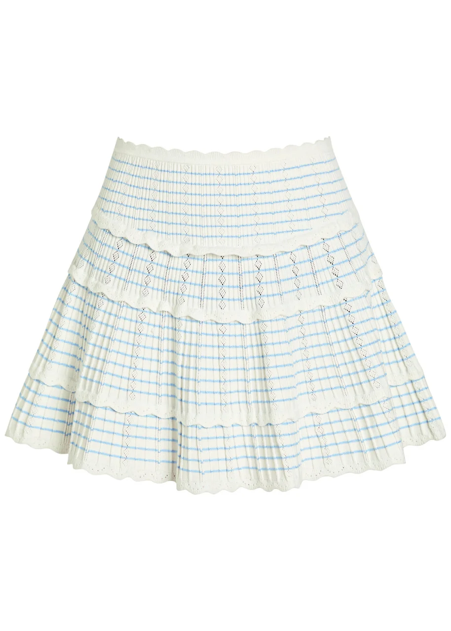 Info & Care LoveShackFancy stretch-knit;skirt Striped, metallic weave, ribbed, pointelle, elasticated waistband, tiered, scalloped trims Pulls on 73% viscose, 17% polyester, 6% elastane, 4% metallic fibres Dry clean Coordinating items available Size & Fit Length waist to hem: 14 inches/ 35.5cm Midweight A-line cut Model is 5'10"/ 178cm and wears a size small