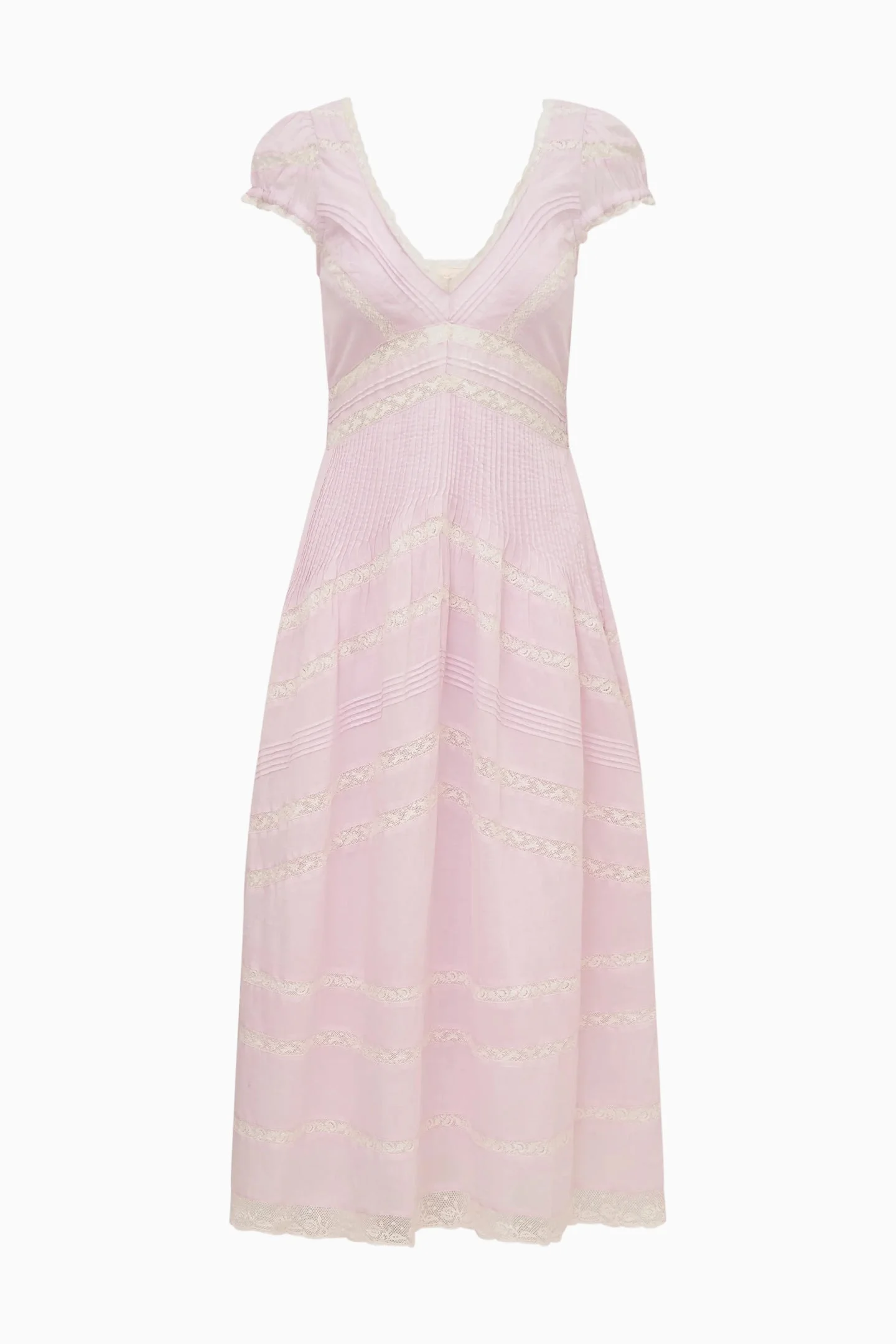 Introducing the Suvi Dress. This Victorian-inspired midi dress stuns with an airy cotton fabric printed with our new, playful confetti bloom print and features vintage-inspired laces all over. The dress begins with short cap sleeves above a v neckline that falls to an empire waist which releases into a sweepy, a-line skirt. There is tucking at the waist giving this piece a feminine silhouette. There’s smocking at the back for ease and comfort and includes pockets. - 100% Cotton - V-neckline - Smocking For Easy Pull On - Includes Pockets DETAILS - 100% Cotton - Hand Wash In Cold Water - Do Not Bleach - Lay Flat To Dry - Low Iron SIZE & FIT Measurements based on Size S: - Length: 50½″ - Bust: 33″ - Waist b(Relaxed): 27½″ - Sweep: 72″
