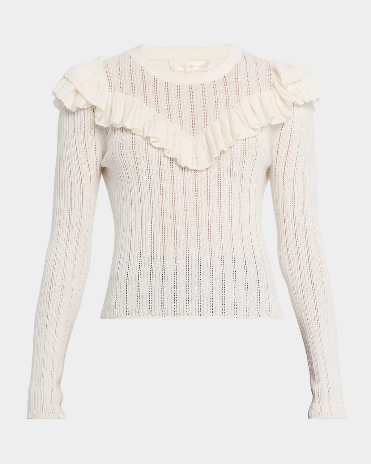 Designed in a lightweight and cozy blend of ultrasoft Peruvian cotton and alpaca, the "Presla" sweater by LoveShackFancy features textural ribbed pointelle stitching throughout and a ruffled detail along the neckline Scalloped crew neckline Long sleeves; approx. 23.8"L Slim fit Hip length Pullover style Cotton/alpaca Hand wash cold and lay flat to dry or dry clean Made in Peru