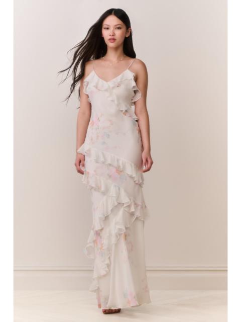 Our best-selling Rialto Dress returns in a sweeping slip silhouette with delicate spaghetti straps and a flattering V-neckline. Lightweight, sheer fabric drapes to a maxi length and is scattered with soft pastel florals, while cascading chiffon ruffles and tiered detailing at the hem turn heads. Details: - Spaghetti straps - V-neckline - Ruffle hem - Pastel flowers print DETAILS - 100% RAYON - LINING: 100% POLYESTER - DRY CLEAN ONLY SIZE & FIT Measurements based on Size 4: - Model Height: 5'10" - Length: 59" - Bust: 34" - Waist: 29" - High Hip: 33 ½" - Low Hip: 37 ½" - Sweep: 99" - Strap Length: 16 ½"
