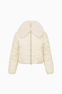 The Sandria Jacket is a cozy, stylish puffer crafted from ivory nylon with LoveShackFancy’s signature heart quilting. Designed with a detachable fur collar, long sleeves, side pockets, and a gold zipper closure, it offers warmth with a feminine, elevated touch. Details: - 100% Nylon - Heart-quilted puffer silhouette - Detachable fur collar - Long sleeves with side pockets - Gold zipper closure - Cozy, stylish, and perfect for winter occasions DETAILS - Self: 100% Nylon - Combo: 100% Polyester - Lining: 96% Polyester, 4% Spandex - Filling: 100% Polyester - Dry Clean Only SIZE & FIT Full length long sleeves. See size guide for details.