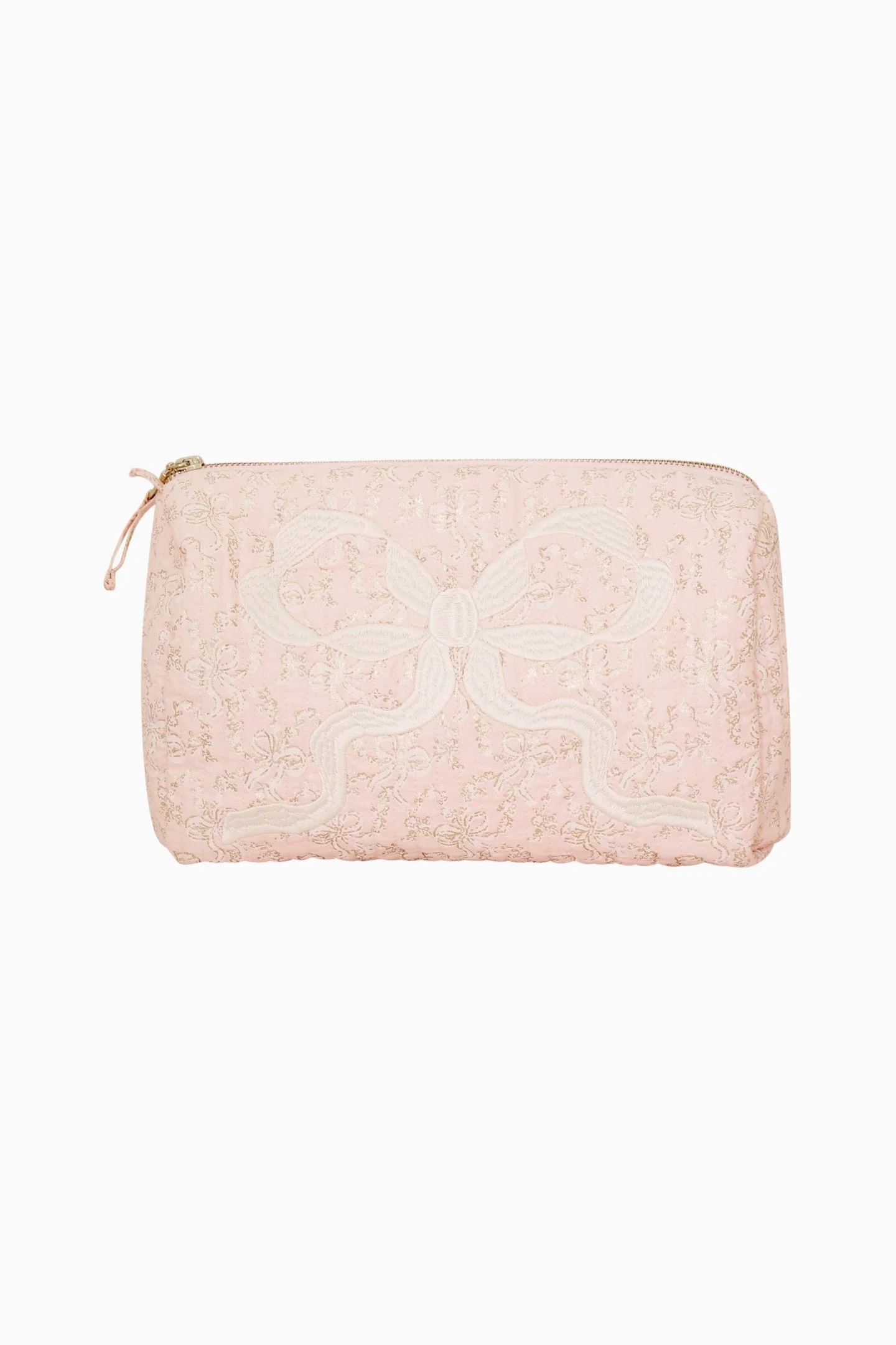 Our Octavia Bag with our signature bow adorned on top-is the perfect clutch or cosmetic purse. It's quilted, soft and compact with a 3D bow. Zip closure at top. DETAILS - 100% Cotton - Hand Wash, Cold Water Only SIZE & FIT - Width: 4 1/2" - Length: 10 3/4" - Height: 10 1/2"