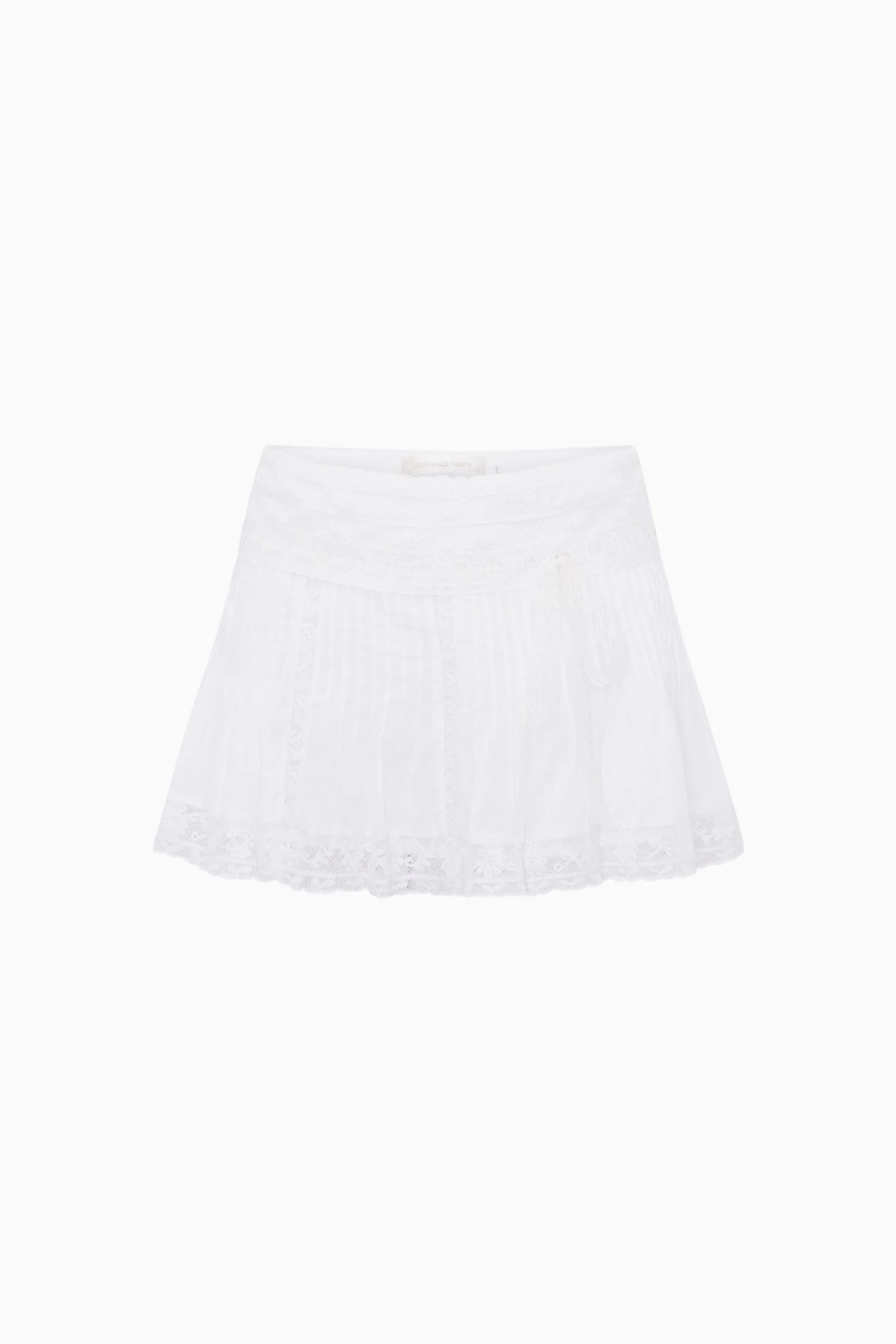 Effortlessly feminine, the Solena Skirt is designed with a breezy skater silhouette and vintage-inspired details. Crafted from lightweight cotton, it features softly structured pintucks, vertical lace panels, a lace ribbon accent at the waist, and scalloped lace hem. Details: - Mini length - Invisible side zipper - Vertical lace panels - Scalloped lace hem DETAILS - 100% COTTON - HAND WASH IN COLD WATER - DO NOT BLEACH - LAY FLAT TO DRY - LOW IRON SIZE & FIT Measurements based on Size 4: - Model Height: 5'11.5" - Waist: 30 1/2" - Length: 14 1/2" - Sweep: 73" - Lining Length: 11"