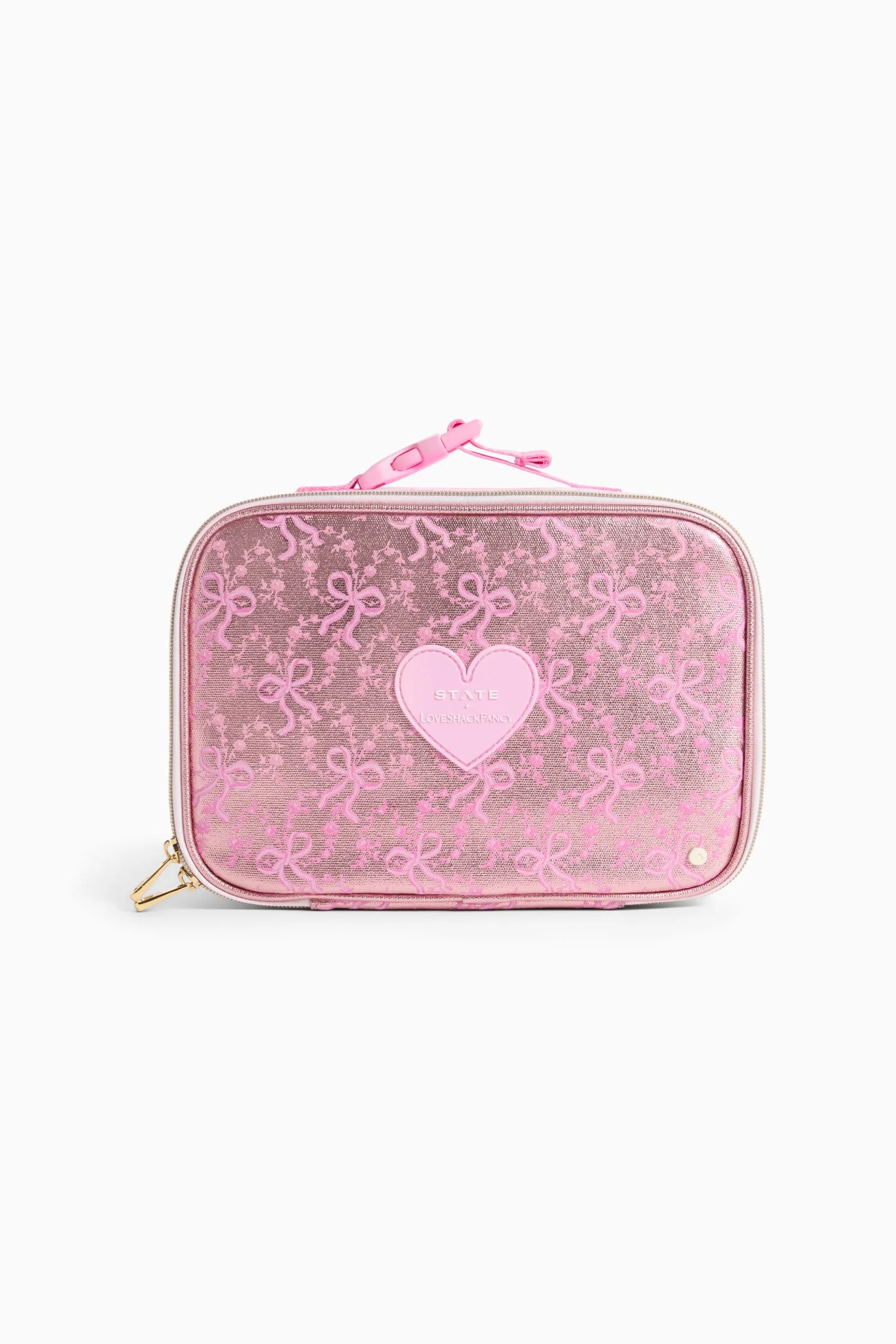 Introducing the Rodgers Lunch Box, as part of our limited-edition collaboration with STATE Bags Just in time for the holidays with a spirited metallic pink fabric, this lunch box keeps their food fresh and organized with a fully insulated main compartment featuring a detachable divider, a zippered mesh pocket for silverware or an ice pace, and see-through pocket adds for notes or pictures. Fits perfectly inside the Kane Backpack for easy carrying. DETAILS - Main Body: 100% Coated Cotton - Interior Lining: 100% Recycled Polyester - Spot clean with a damp cloth SIZE & FIT 7.28" H x 10.43" W x 3.35" D