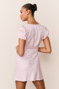 Designed in our custom satin jacquard, the Sylara Dress is a flirty, bias-cut mini with an empire waist and soft shirring at the bust. Lace striping traces the neckline and puff sleeves, which feature elastic at the openings for a perfect fit. Finished with a hidden back zipper for effortless wear. Details: - 60% Viscose, 40% Silk - Bias-cut fit-and-flare mini with empire waist - Shirred bust and lace-trimmed neckline - Puff sleeves with elastic at openings - Hidden back zipper DETAILS - 100% Silk - Dry Clean Only SIZE & FIT Measurements based on Size S: - Length: 32" - Bust: 35 1/2" - Waist: 30 1/2" - High Hip: 36" - Sweep: 56" - Sleeve Length: 7 1/4"