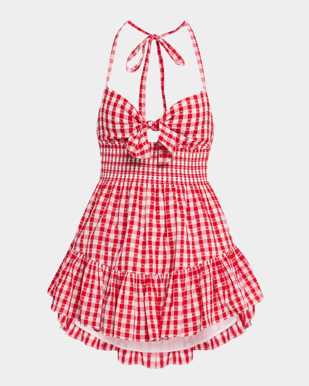 Crafted of cotton, the "Trishelle" mini dress from LoveShackFancy is adorned with a gingham print featuring a bowaccented halter neckline and a smocked elastic waistband. Approx. 25"L from shoulder to hem Halter neckline Sleeveless Hem falls above the knee Back tie closure Cotton Hand wash Imported