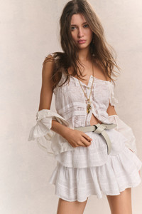 Our new Sully Top breezes in with lofty sunflower embroidery, sheer inset floral lace panels and horizontal pintucking details. The straps of this cotton tank blouse are constructed with satin ribbons, bordered by scalloped lace. Functional pearlescent buttons line the center front of the roomy bodice. The bottom features a rambling scalloped trim reminiscent of petal contours, finished with broderie anglaise embroidery. Pair it with our new Ruffle Mini Skirt. - Runs slightly large, size down for slimmer fit *Due to the nature of the hand dye process, colors may vary from what is pictured. DETAILS - 100% Cotton - Made in India - Hand Wash Cold Water Only, Lay Flat To Dry - Length: 20" SIZE & FIT Measurements based on Size S: - Length on Body: 20" - Bust: 36 1/2" - Sweep: 48 1/2" - Not fitted, flowy top - Model Height: 5'8" - Runs slightly large, size down for slimmer fit
