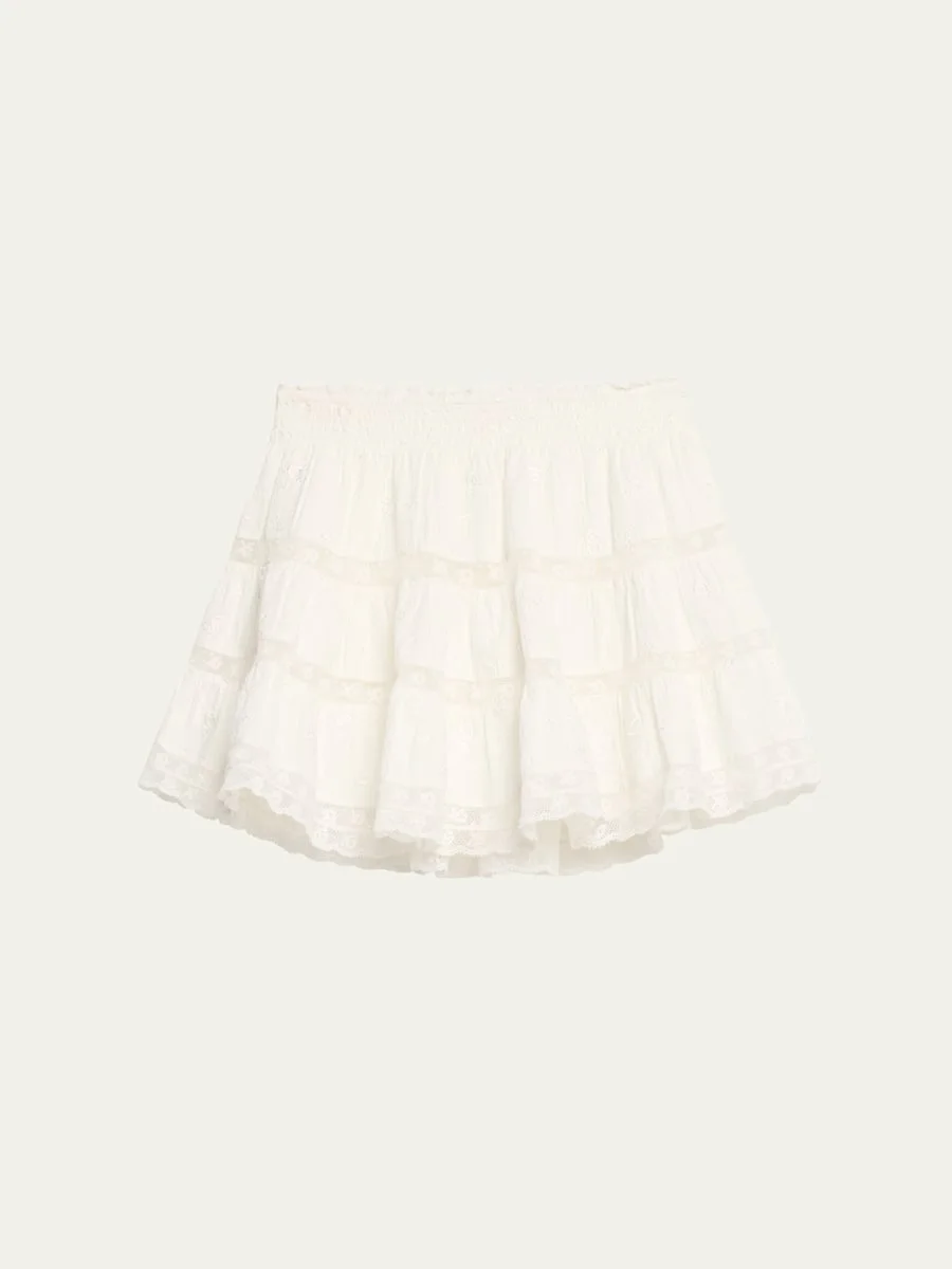 LoveShackFancy "Viro" mini skirt inset with feminine floral lace Highrise waistband Hem falls above the knee Skirt falls straight from hip to hem Slipon style Cotton Lining: Cotton Imported