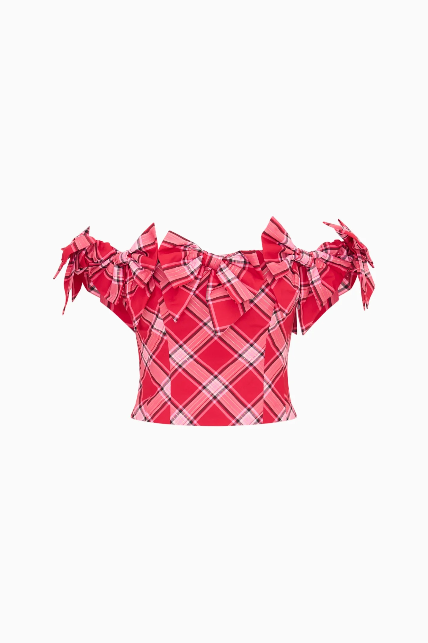 Romantic and statement-making, the Winston Top captures the magic of a holiday evening. Designed from rich taffeta fabric, this cropped off-the-shoulder silhouette features princess seams for a beautifully sculpted fit. Along the neckline, gorgeous bows are delicately placed, adding whimsical charm and drama. The elastic armbandsensure comfort and flexibility beneath the bows, while a hidden side zipper allows for a seamless finish. - 100% Polyester taffeta - Cropped, off-the-shoulder silhouette - Elastic armbands for comfort - Zip closure DETAILS - 100% Polyester - Dry Clean Only SIZE & FIT Measurements based on Size 4: - Length: 11 1/2" - Bust: 34" - Waist: 29" - Sweep: 33 1/2"