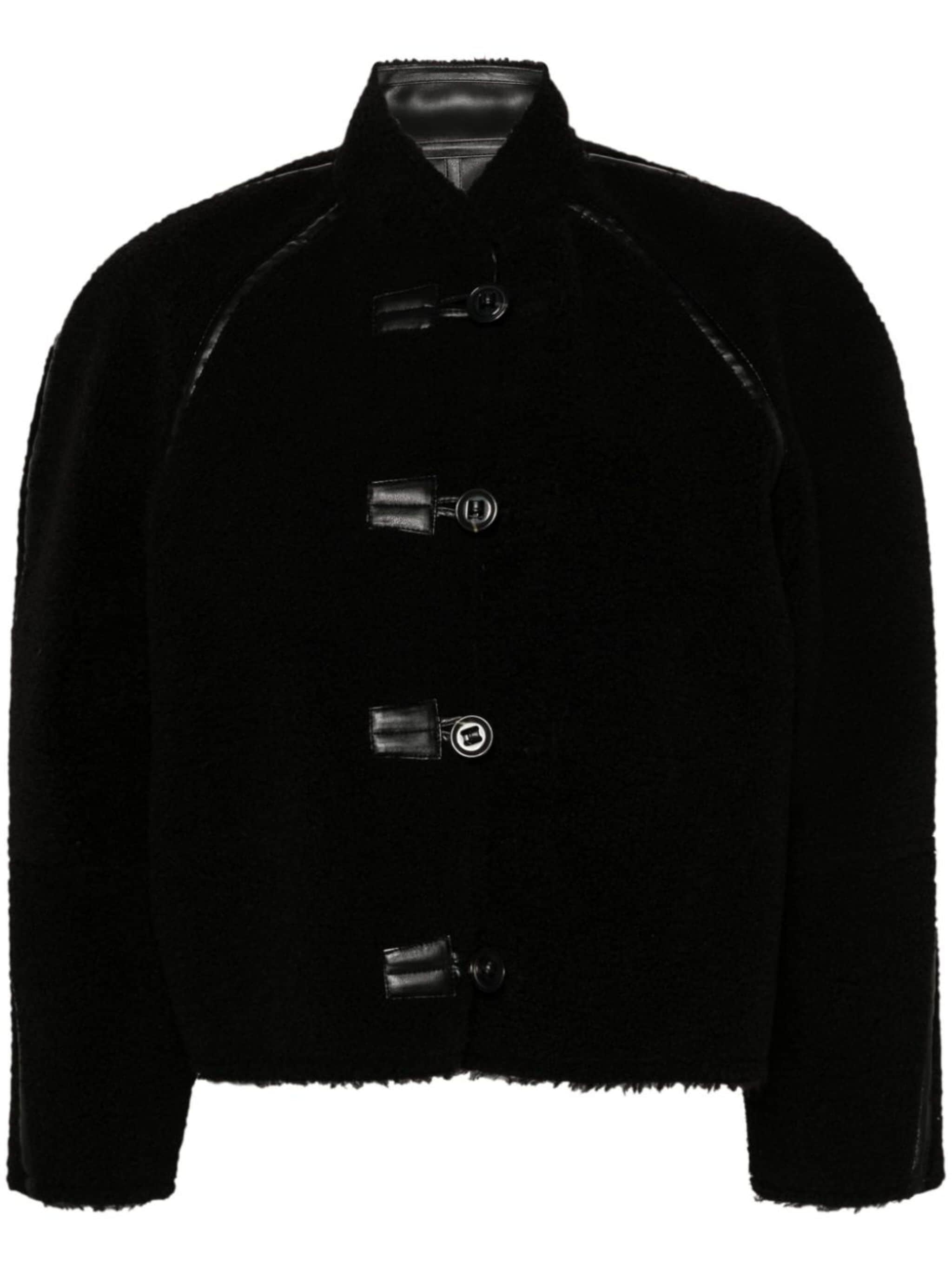 black faux shearling high neck front button fastening long raglan sleeves two side slit pockets straight hem faux-leather lining Size & Fit Model Measurements: Height: 1.77 m Bust/Chest: 88.0 cm Hips: 96.0 cm Waist: 66.0 cm Model wears size XS Fabric and Care Designer Style ID: LW244JP05 Designer Colour: BLACK Composition: Artificial leather 100%, Polyester 100% Washing instructions: Dry Clean Only
