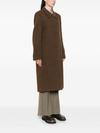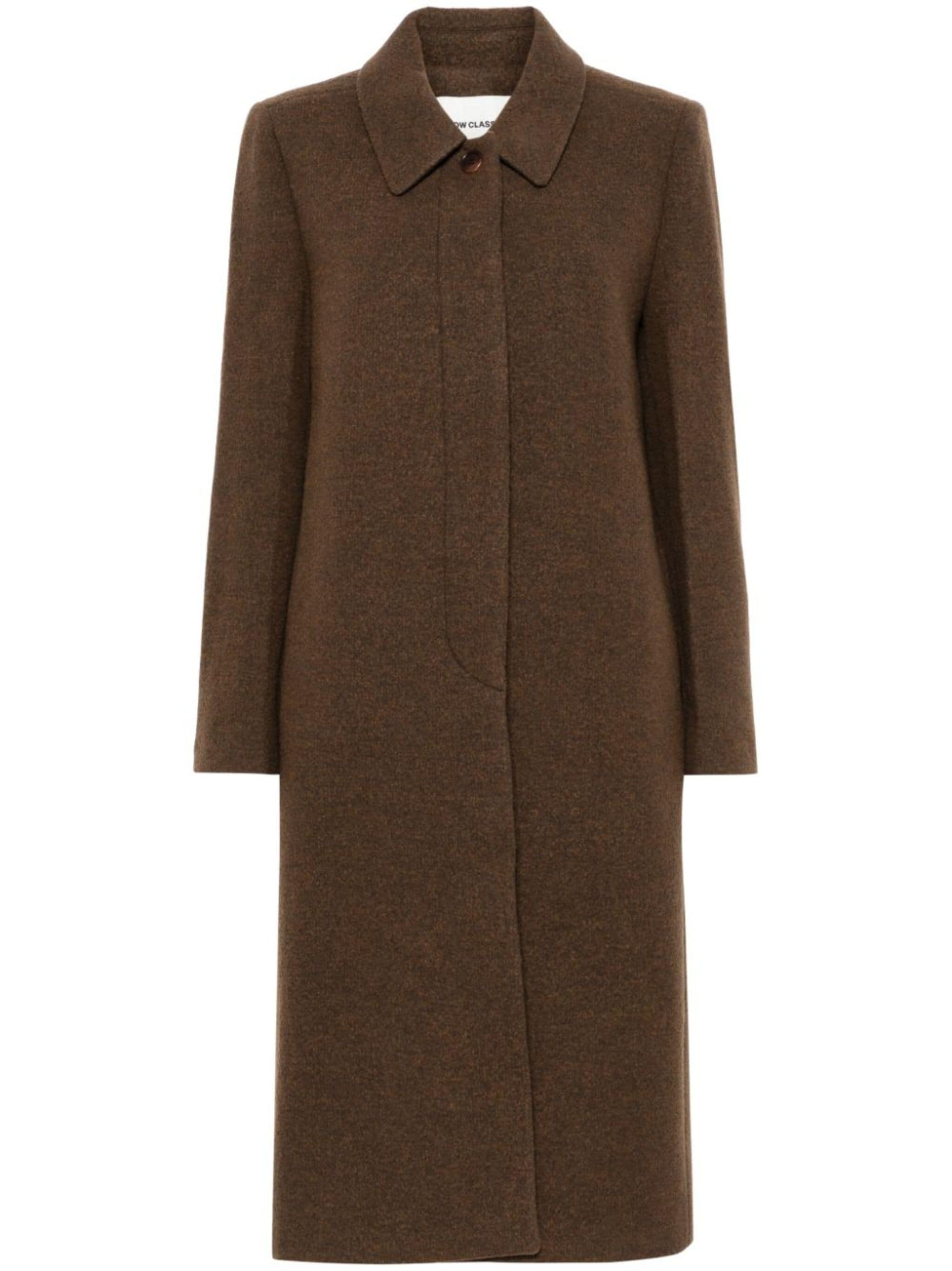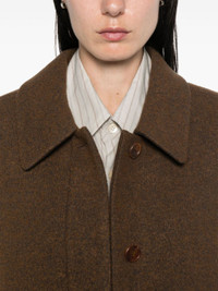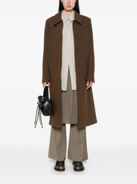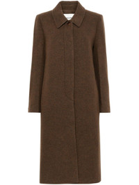 camel brown wool blend melange effect brushed effect concealed front button fastening straight-point collar long sleeves buttoned cuffs two side inset pockets central rear vent full lining internal slip pocket straight hem Size & Fit Model Measurements: Height: 1.76 m Bust/Chest: 82.0 cm Hips: 90.0 cm Waist: 64.0 cm Model wears size S Fabric and Care Designer Style ID: LW244CT09 Designer Colour: BROWN Composition: Outer: Nylon 16%, Wool 84%; Lining: Polyester 100% Washing instructions: Dry Clean Only Made in Republic of Korea