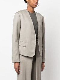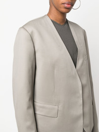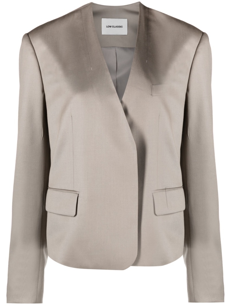 single-breasted collarless blazer from LOW CLASSIC featuring beige, khaki, wool, concealed front fastening, jetted chest pocket, two front flap pockets and long sleeves. Size & Fit Model Measurements: Height: 1.76 m Bust/Chest: 81.0 cm Hips: 92.0 cm Waist: 59.0 cm Model wears size S Fabric and Care Designer Style ID: LOW23SCBZ040 Designer Colour: KH BEIGE KHAKI Composition: Outer: Wool 100%; Lining: Polyester 100% Washing instructions: Dry Clean Only Made in Republic of Korea