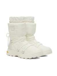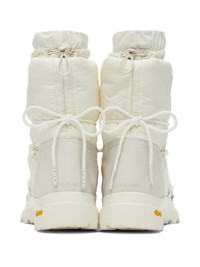 Ankle-high insulated quilted taffeta boots in white. · Rubber cap toe · Wraparound lace-up closure · Bungee-style drawstring at collar · Rubberized logo patch at outer side · Taffeta lining · Logo-embossed rubber trim at heel · Treaded Vibram® rubber sole Supplier color: Ivory