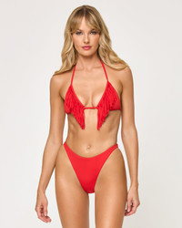 We love a good triangle top so we decided to get crazy and add fringe to our fave style. The Sienna boasts minimal coverage and support and features ties around the neck and back. The fringe at the cups is the icing on your cakes (wink, wink). - Triangle top - Tie around neck - Tie around back - Fringe at cups - Size XS-XL - 82% Polyester | 18% Spandex - Style # LSSIT25 FIT - Coverage: Minimal - Support: Minimal - Model Measurements: Lura, size S - Height 5'9, Bust 32", Waist 24", Hips 34"