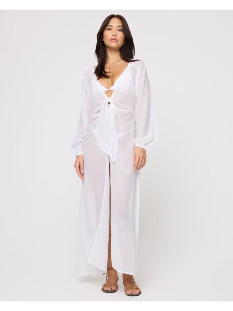 All eyes will be on you in this printed sheer cover--up. The Anna bringing the retro glam vibes with voluminous sleeves, open center front + tie waist. - Sheer Coverup - Tie At Front Center Waist - Voluminous Sleeve - Opened At Center Front - V neckline - Center front slit - Unlined - Size XS-XL - 100% Polyester - Style # ANNDR23 FIT - Model Measurements - Jocelyn, size S - Height 5’9”, Bust 32", Waist 24", Hips 34"