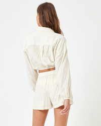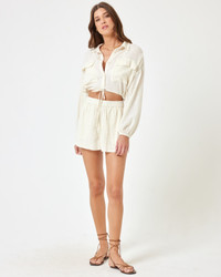Ok, we think we may have made the perfect travel outfit! Introducing the Bora Top. This button-down long sleeve top has a drawstring waist that you can cinch in or out. We leveled-up and combined those details with double breasted pockets and a coordinating drawstring at the cuffs. Wear this puff sleeve top with the matching shorts and you'll be ready for takeoff. - Long Sleeve - Puff Sleeve - Drawstring At Cuff - Drawstring At Waist - Double Breast Pocket - Collared - Button Down - XS-XL - 100% Cotton - Style # BRATP24 FIT - Model Measurements: Maitlynn, size S - Height 5'9, Bust 34", Waist 24", Hips 35"