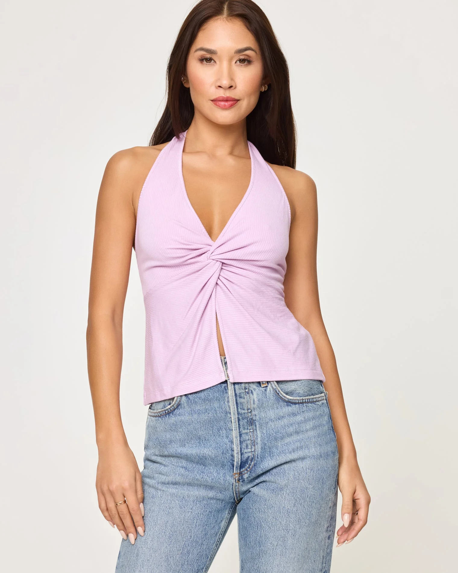 The Callie Halter is here to play some peek-a-boo with a flirty open stomach style. This super-soft ribbed v-neck also has a double-lining, knot front and thick halter straps. - Halter - Tank - V neck - Knot front - Open stomach - Love forever rib - 90% Viscose 10% Elastane - Style # CALTP25 FIT - Model Measurements: Jocelyn, size S - Height 5’9”, Bust 32", Waist 24", Hips 34"